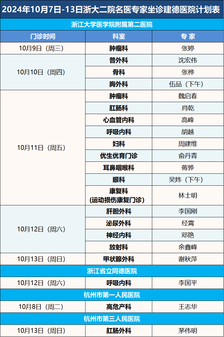 说明:此表为专家派驻计划表(可能存在变化),建议提前网上预约或电话咨询。 咨询电话:门诊服务中心 0571-64096659